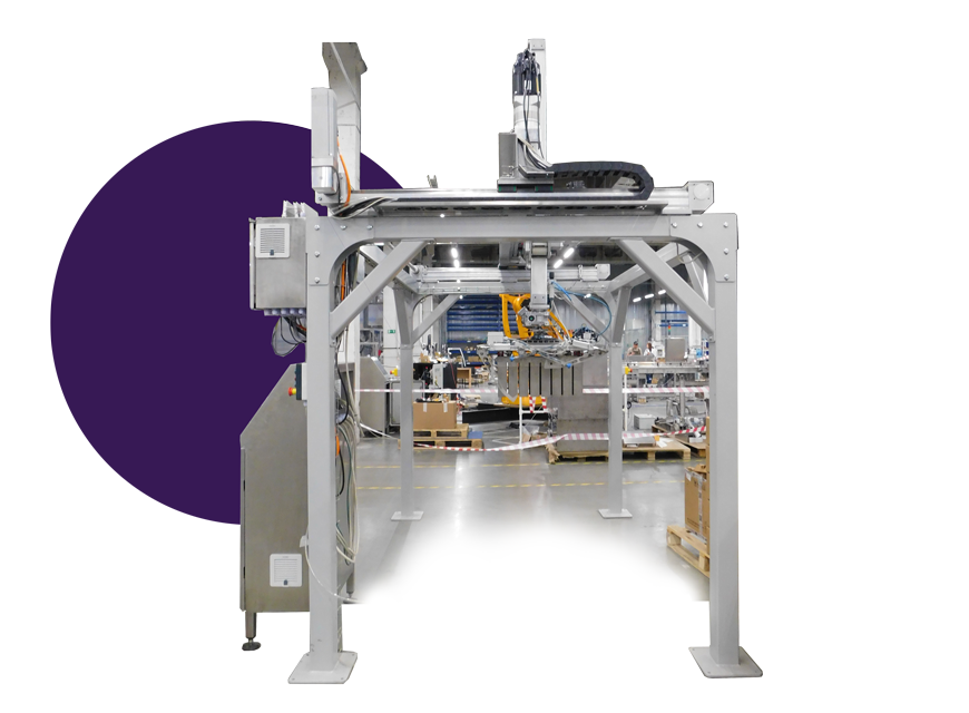 Предназначен для автоматизации процесса укладки готовой продукции в транспортную упаковку. Оборудование интегрируется в производственные линии на промышленных предприятиях.